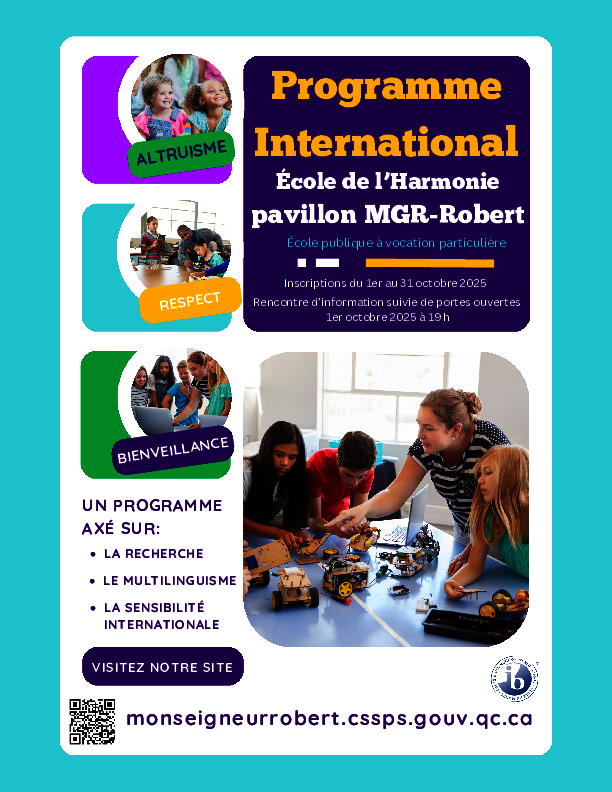 C'est bientôt le temps de s'inscrire au Programme d'éducation international pour l'année 2026-2027. Une rencontre d'information aura lieu le 1er octobre 2025, dès 19 h, au gymnase de l'école Monseigneur-Robert.